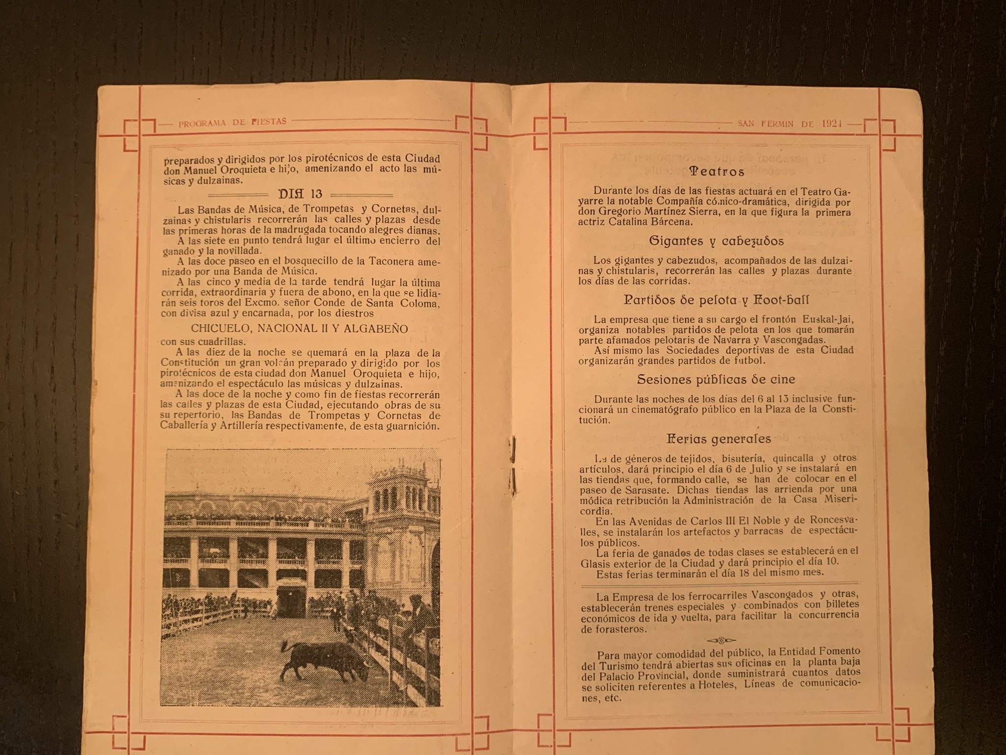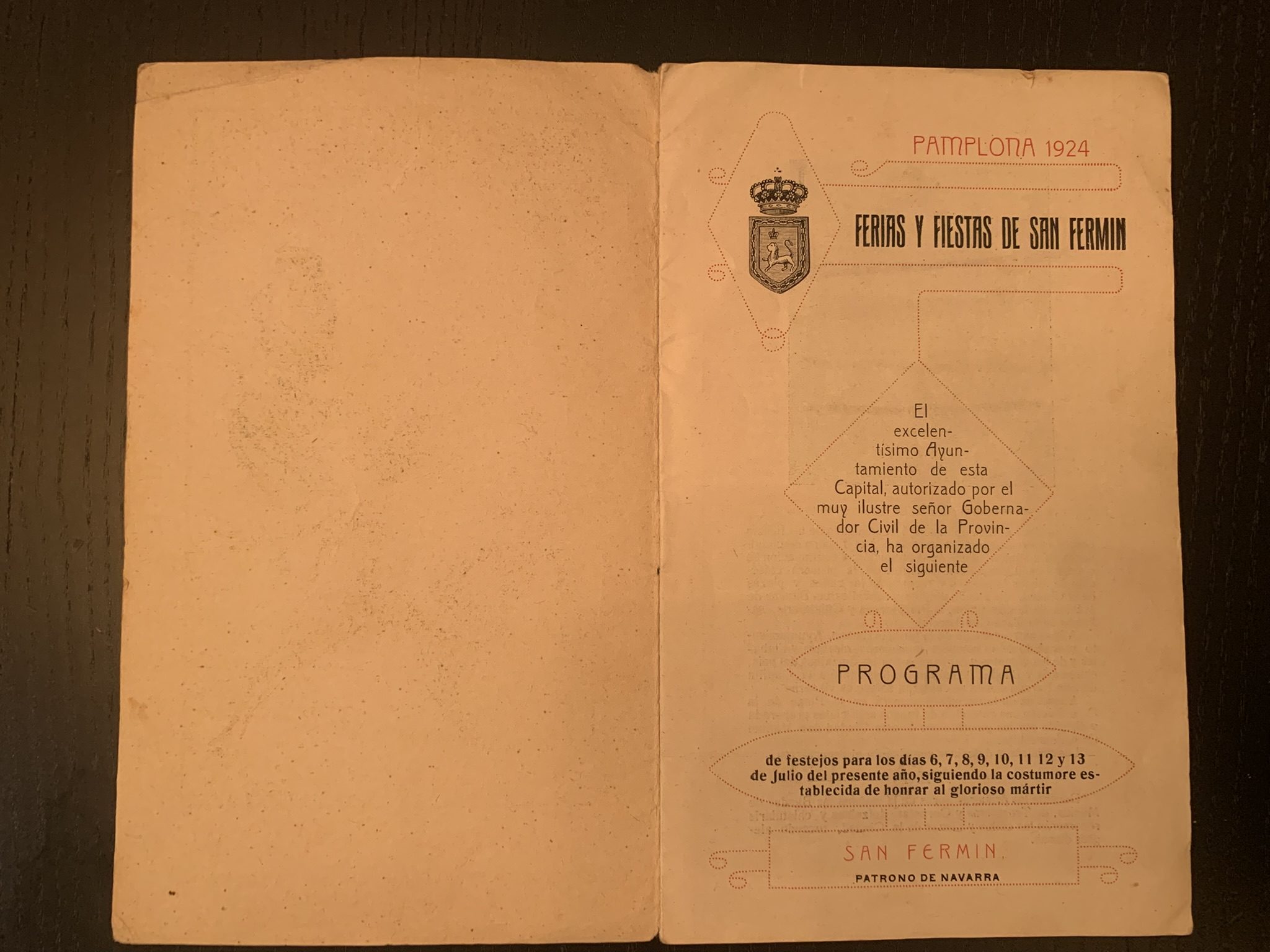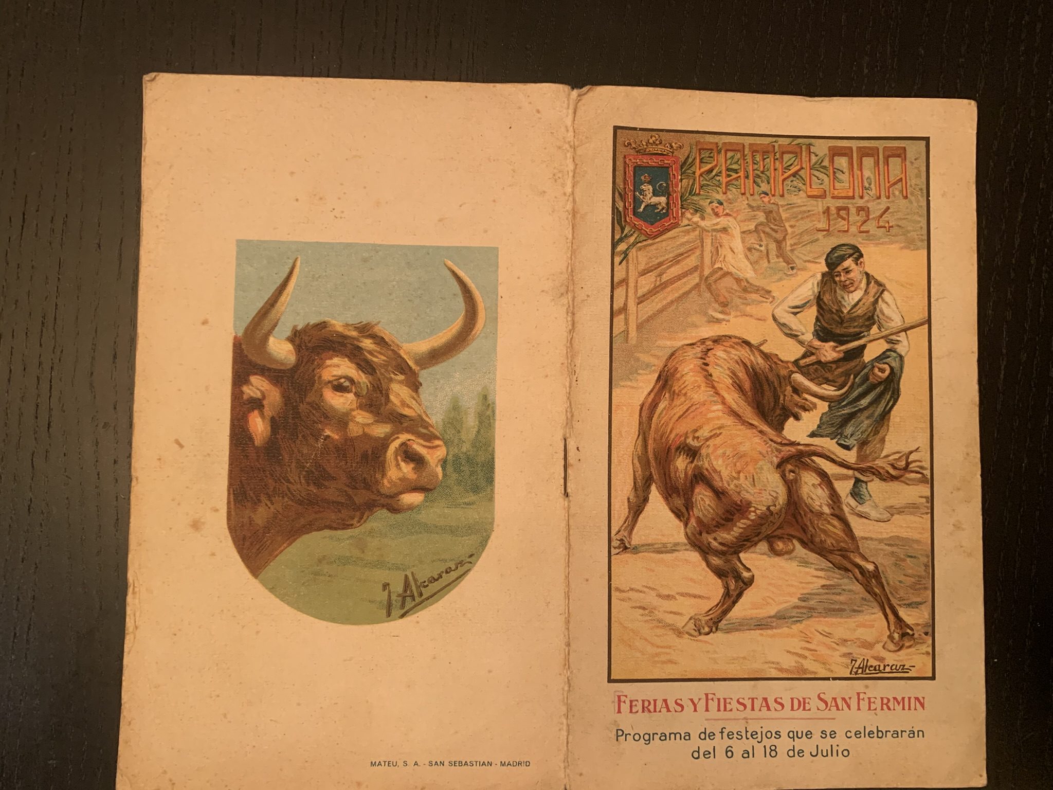 Programa de San Fermín con una bonita portada realizada por Julian Alcaraz de mozo encarando al toro con una vara en una mano y una chaquetilla en la otra. Se pueden ver dos mozos mas agarrados al fondo. En la contraportada podemos ver la cabeza de un toro bravo.