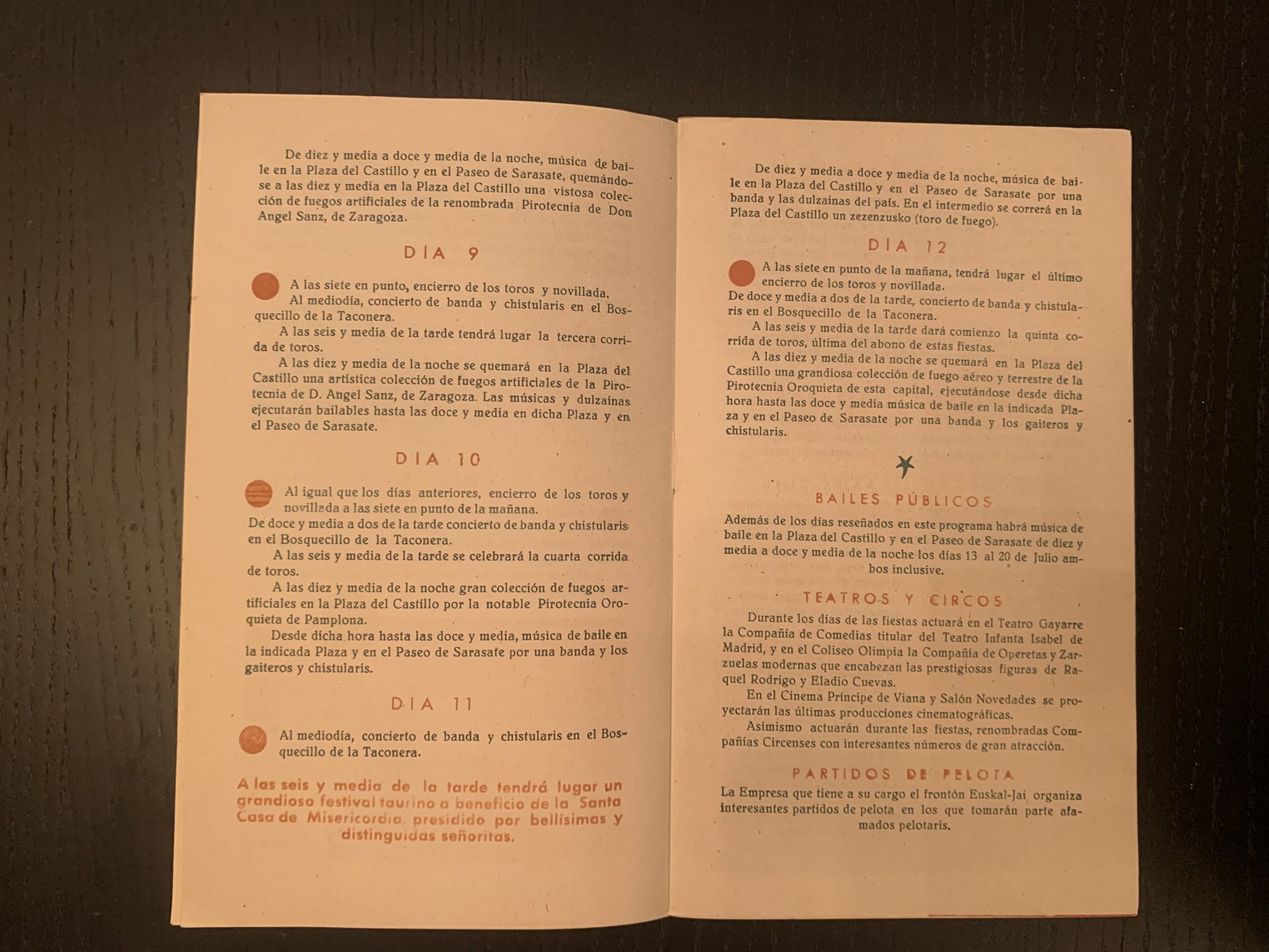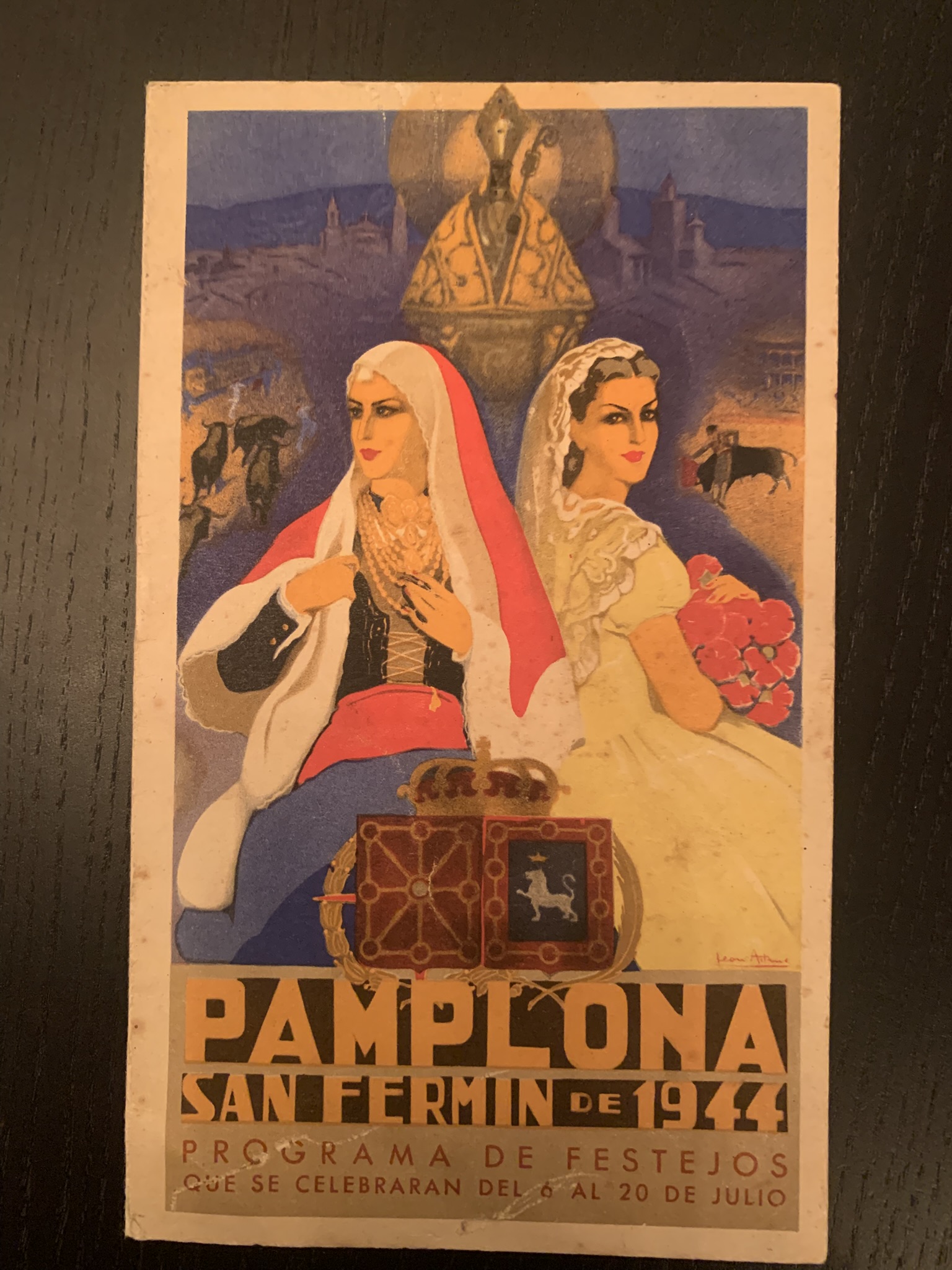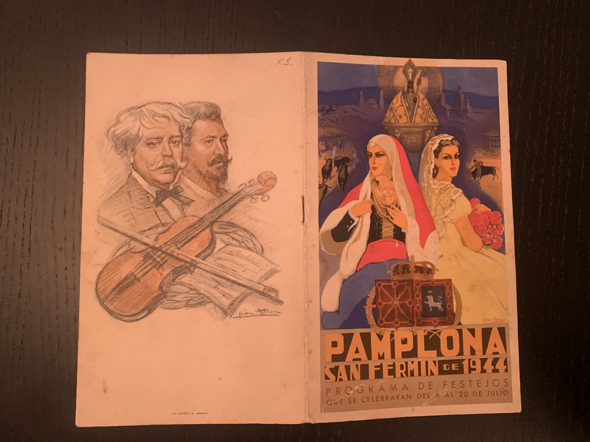 Programa de San Fermín con una oscura portada realizada por Manuel León Astruc donde se plasma dos señoras en primer plano con mantillas y flores sobre una imagen de San Fermín sobre sus cabezas y los escudos de Pamplona y Navarra en primer plano.  En la contraportada una dibujo de Pablo Sarasate y Julián Gayarre grandes navarros de la cultura universal.