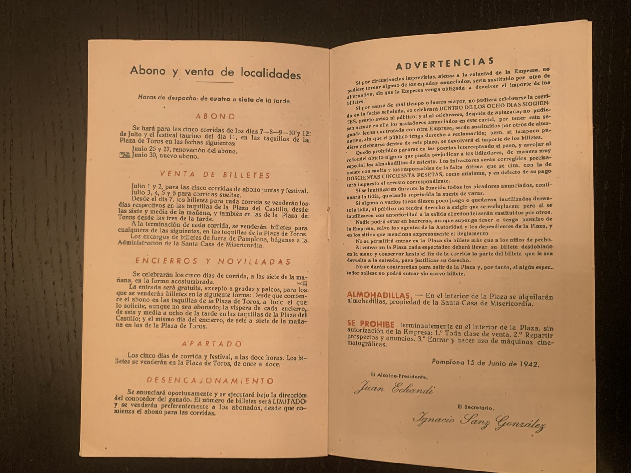 Programa de San Fermín con una oscura portada realizada por Manuel León Astruc donde se plasma dos señoras en primer plano con mantillas y flores sobre una imagen de San Fermín sobre sus cabezas y los escudos de Pamplona y Navarra en primer plano.  En la contraportada una dibujo de Pablo Sarasate y Julián Gayarre…
