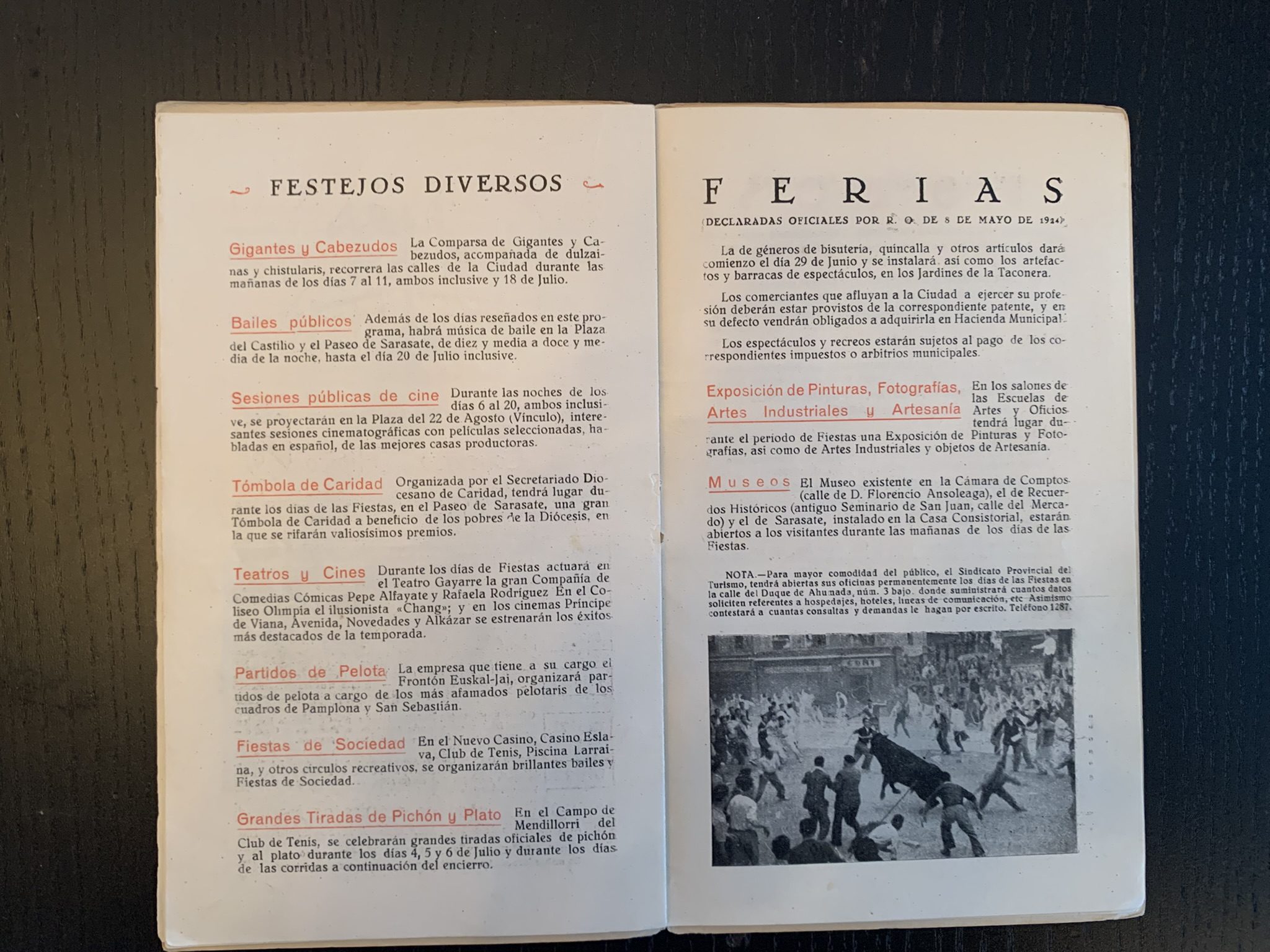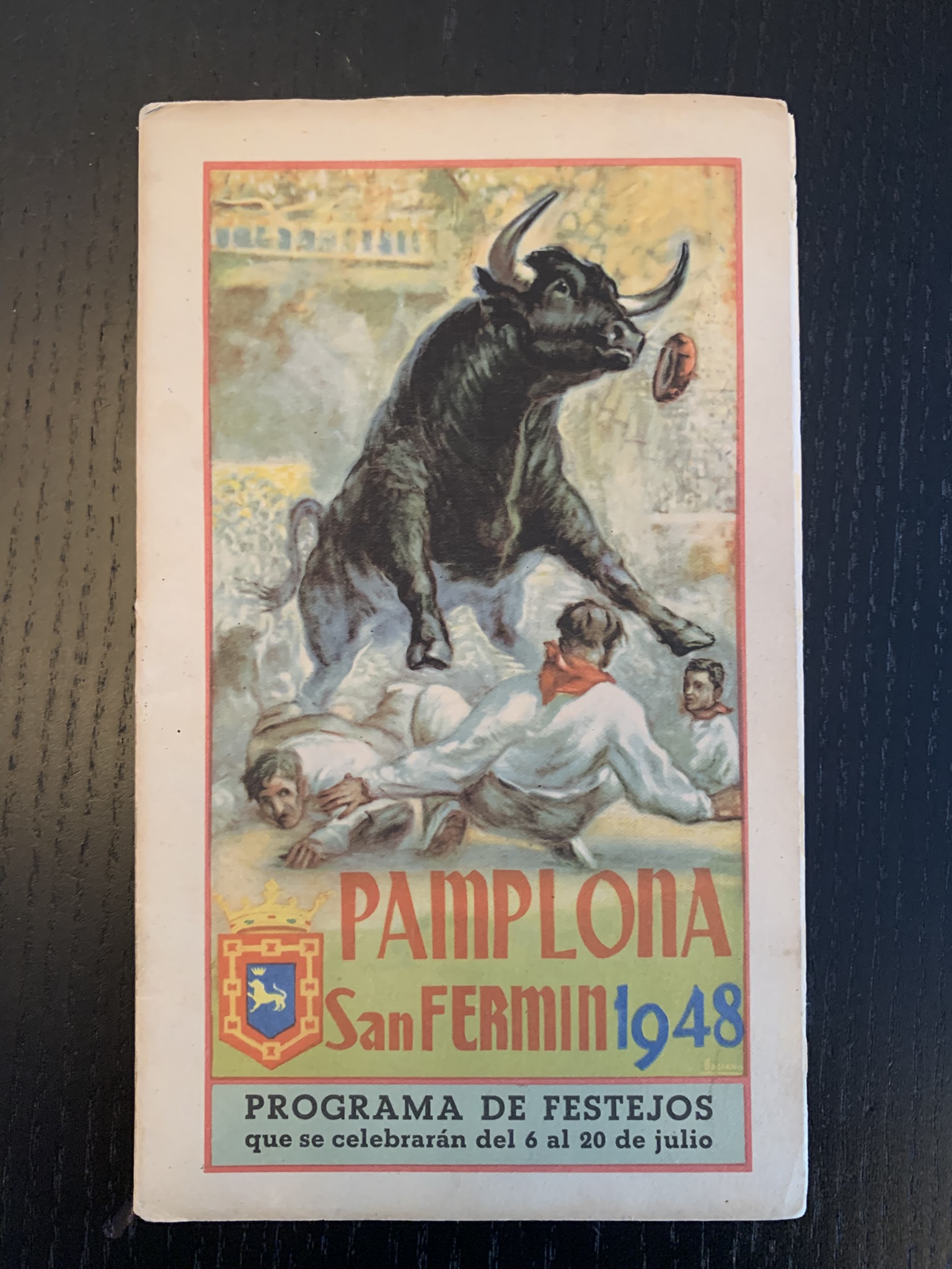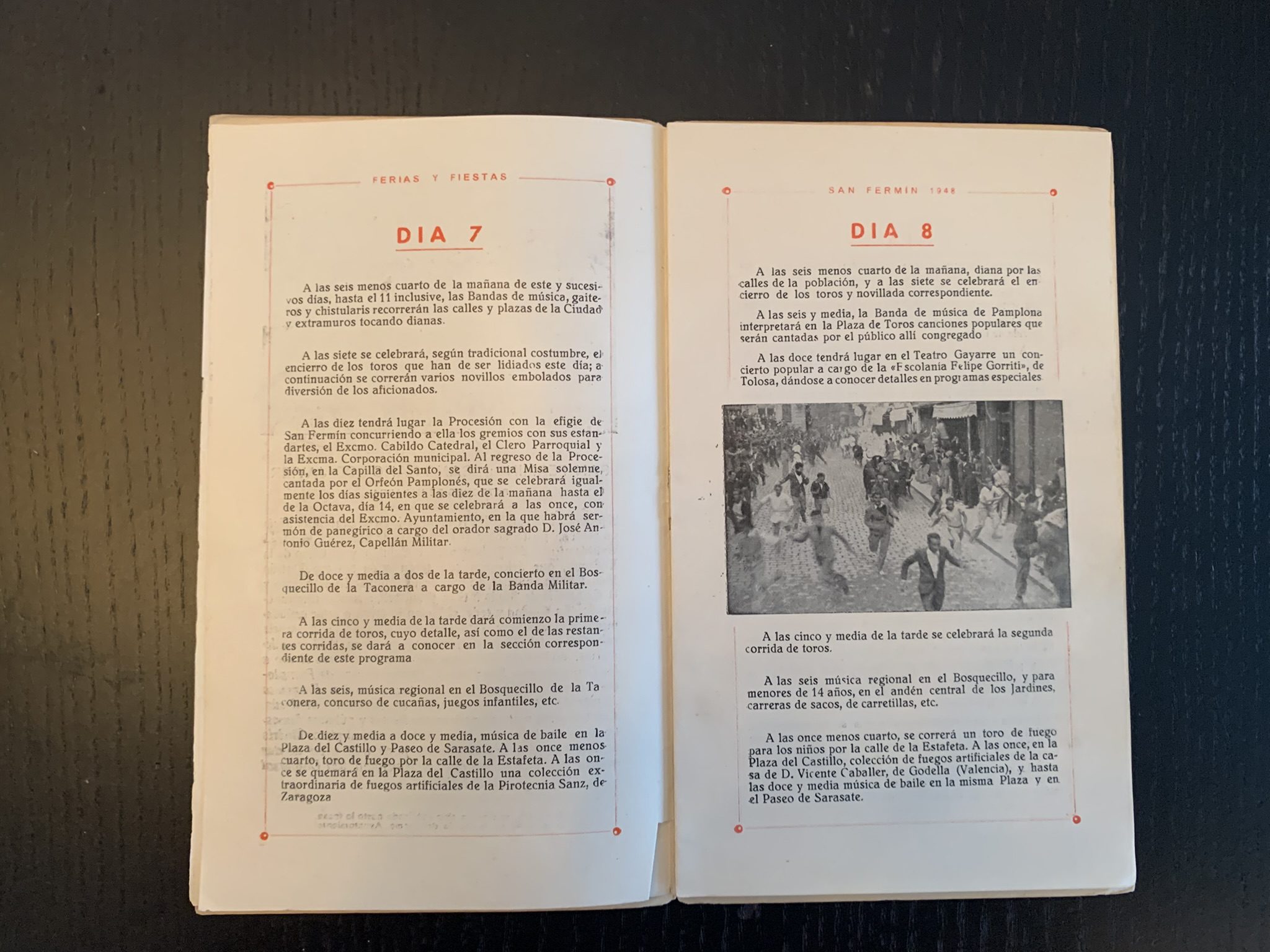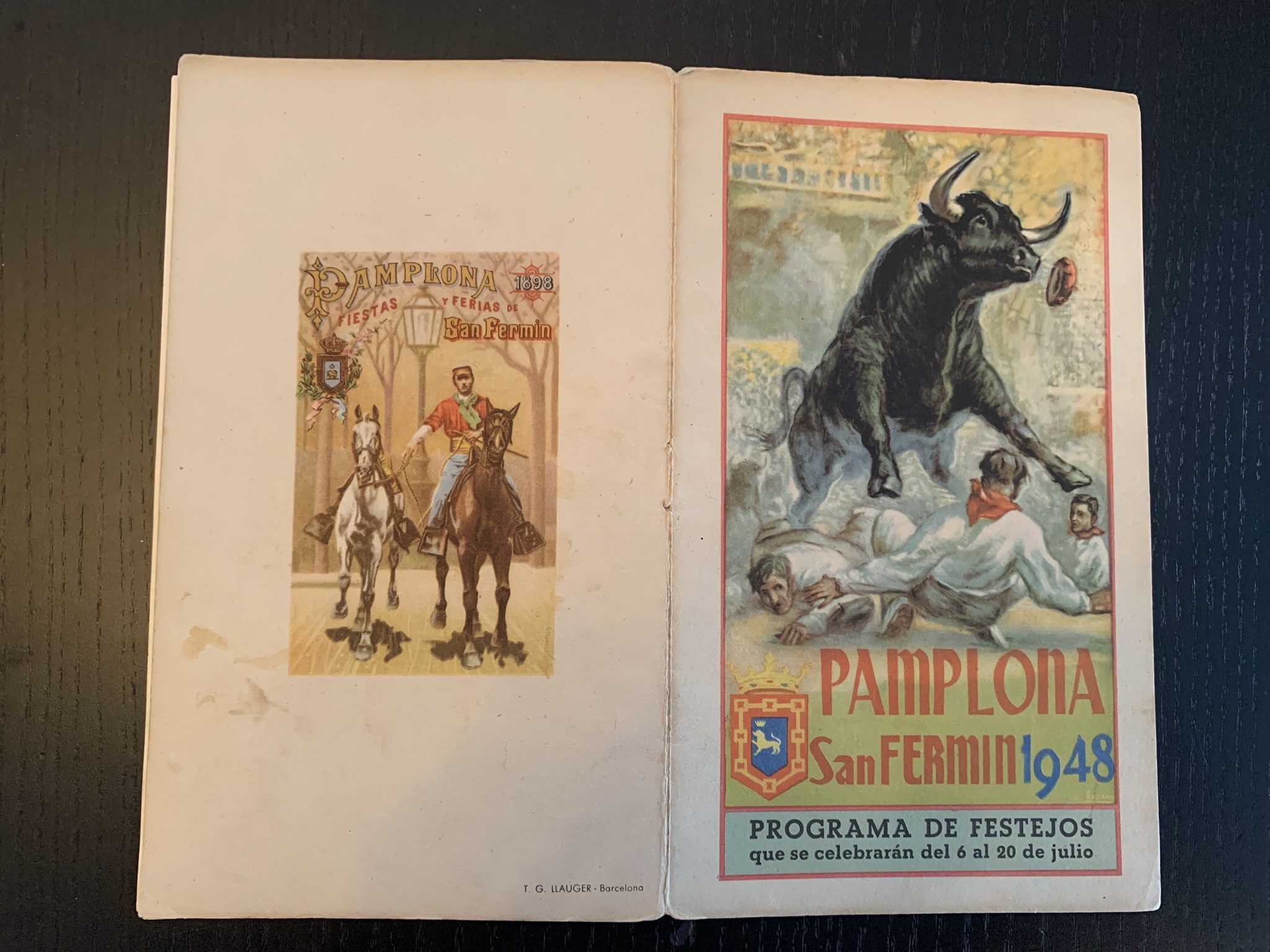 Programa de San Fermín con una bonita portada realizada por Acha y Ameiro donde se plasma una imagen de un pequeño montón en el encierro. En la contraportada una imagen de un caballero montado a caballo guiando a otro.