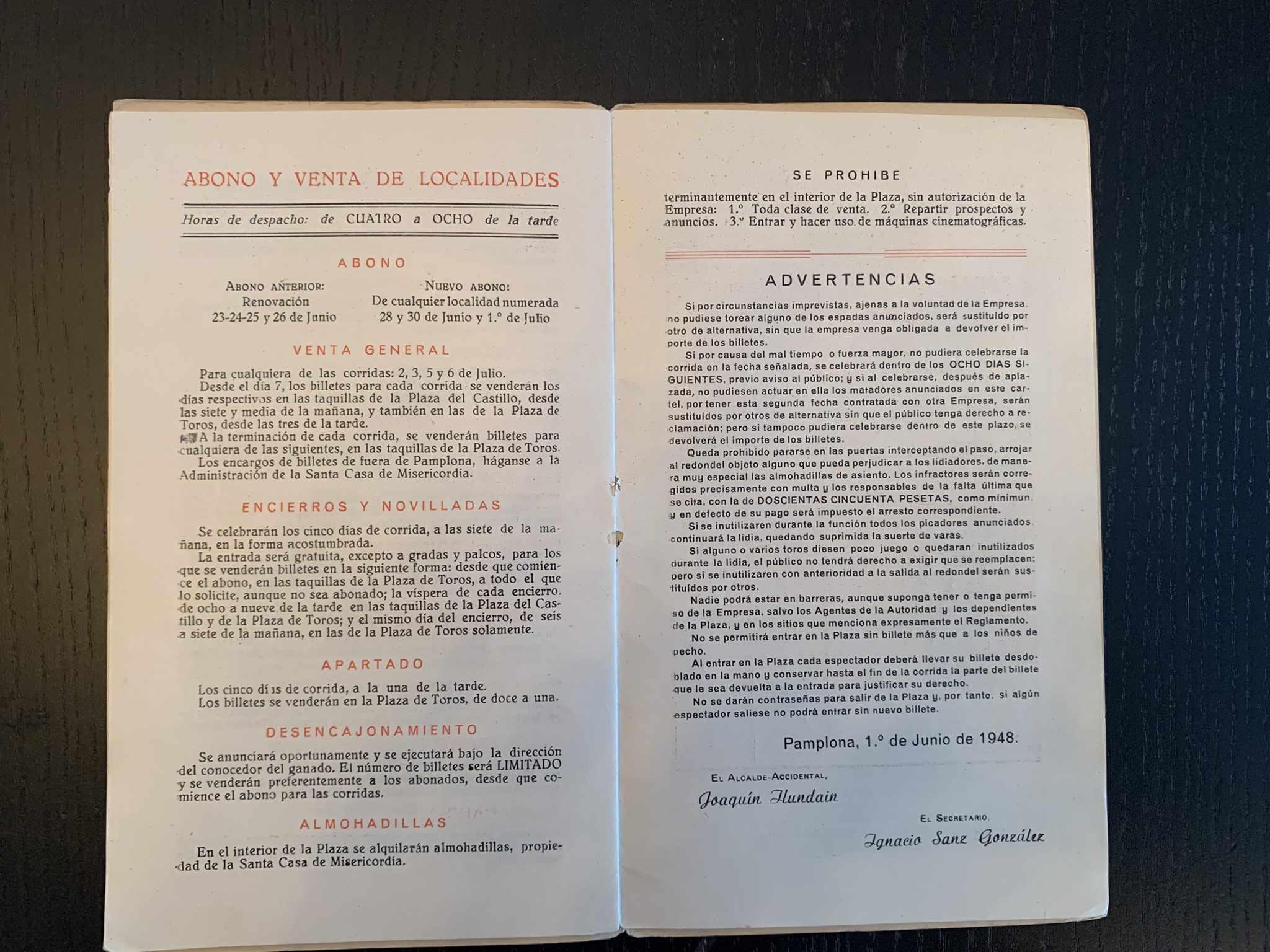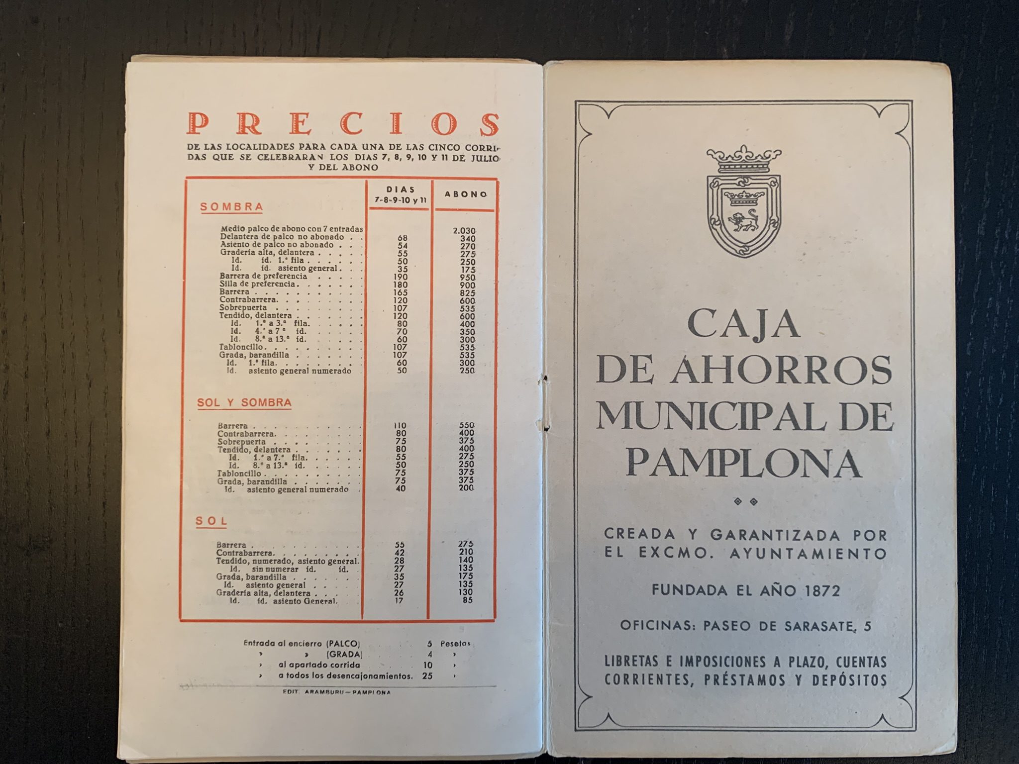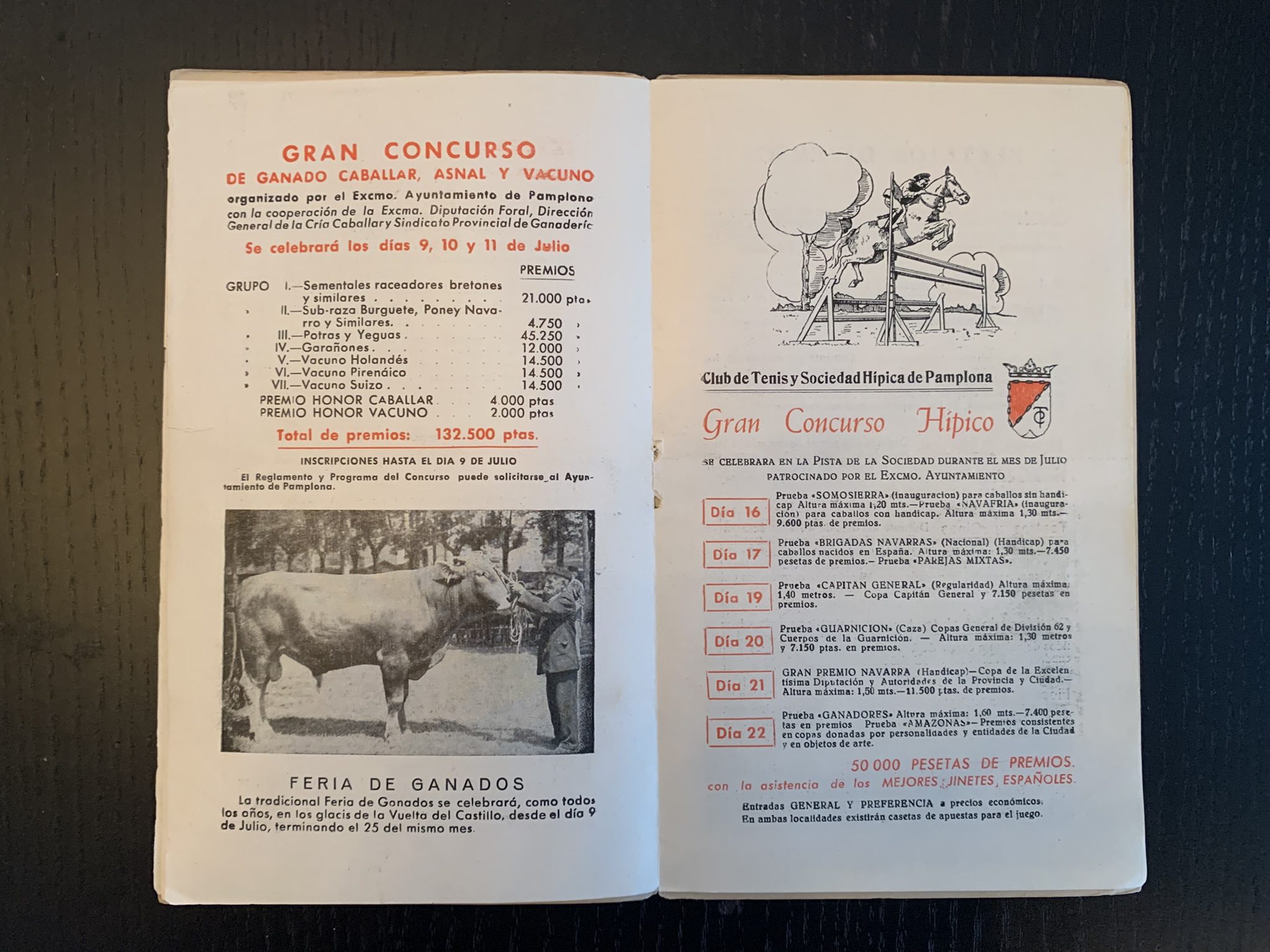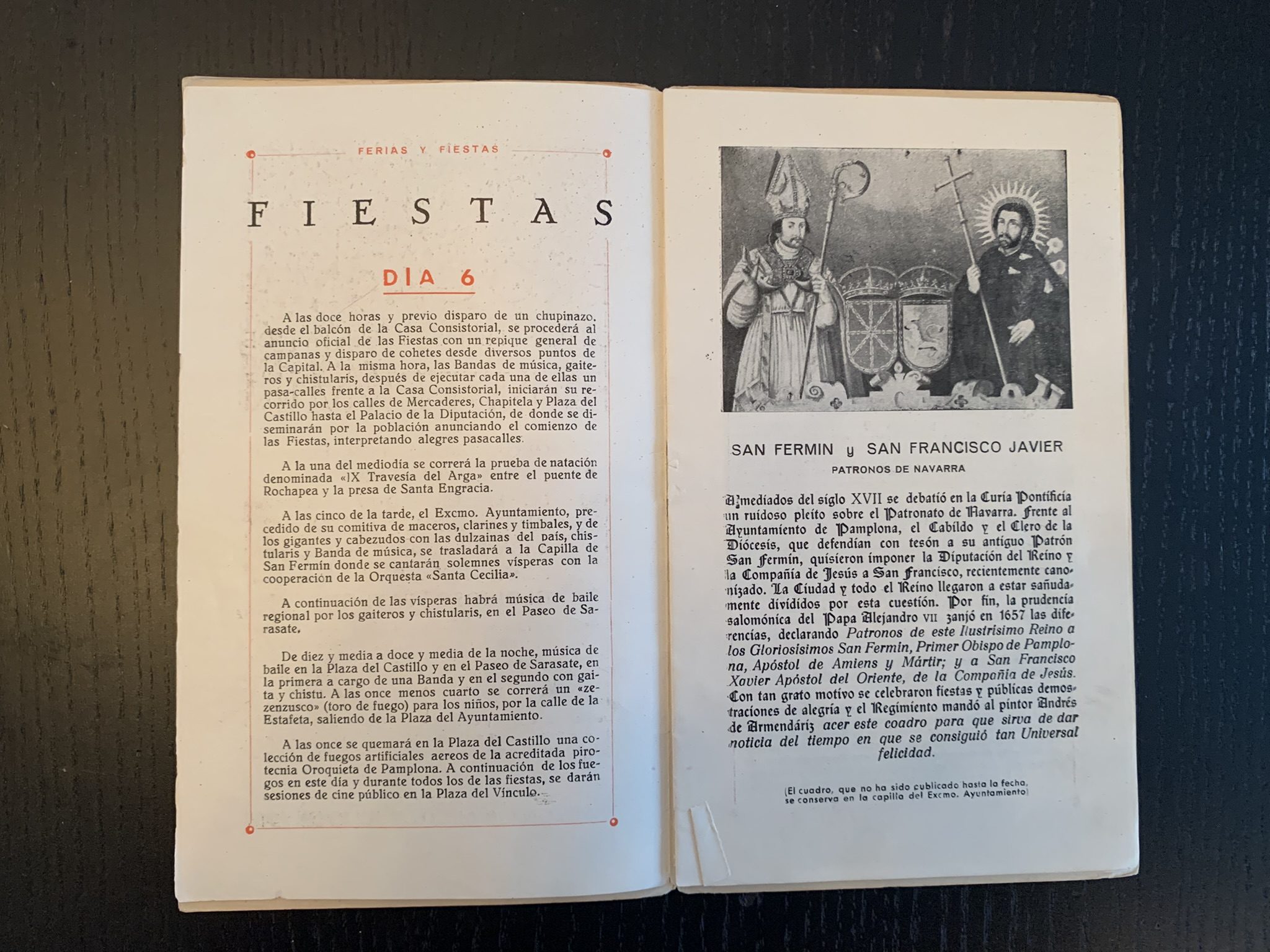 Programa de San Fermín con una bonita portada realizada por Acha y Ameiro donde se plasma una imagen de un pequeño montón en el encierro. En la contraportada una imagen de un caballero montado a caballo guiando a otro.